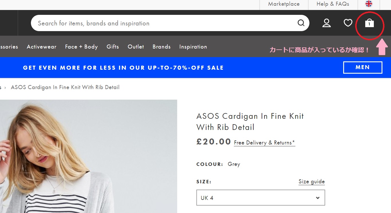 少し小さくて分かりづらいのですが、右上のカートのマークで買い物カゴに商品が入っているか確認できます。