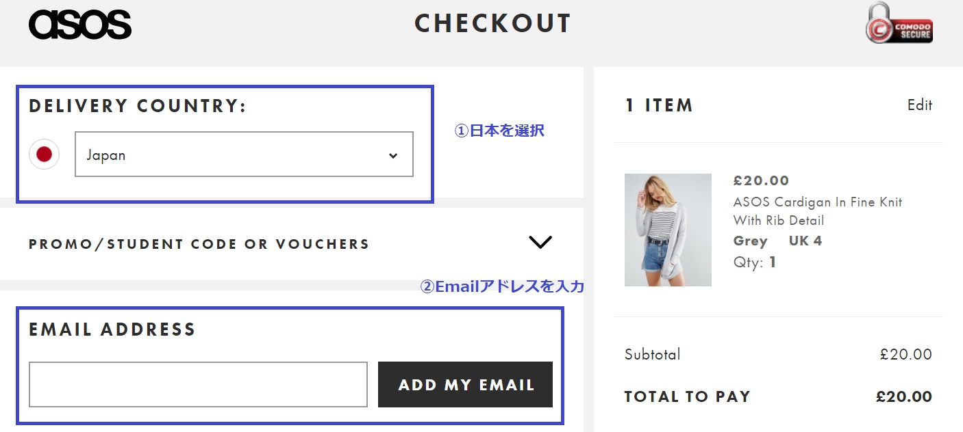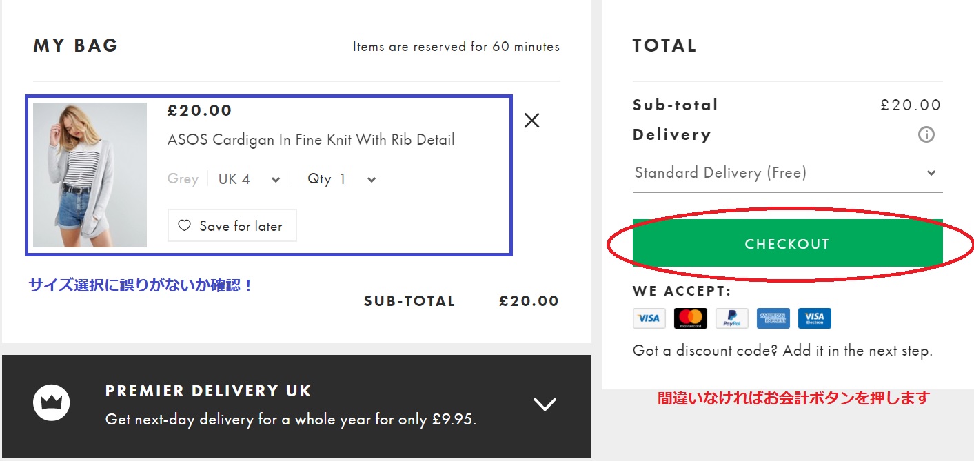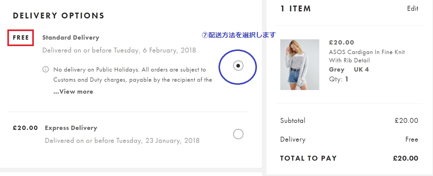 ・DELIVERY OPTIONS・・・配送方法の選択です。ASOS(エイソス)の場合は20£(£)以上の商品は追跡のない普通郵便(Standard Dalivery)は送料が無料(FREE)です。