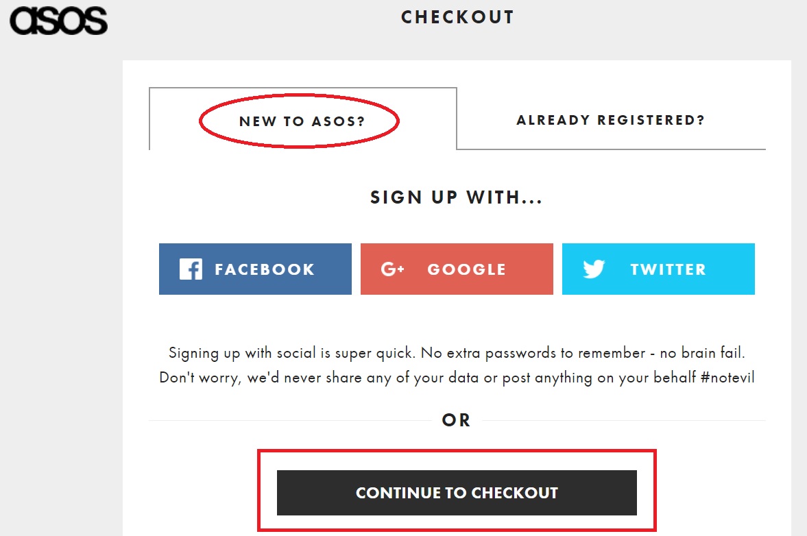 ・NEW TO ASOS・・・初めての購入の場合は、新規登録から進めるので、ご自身のSNS(Facebook、Twitter、Google+)または、「CONTINUE TO CHECKOUT」を押します。