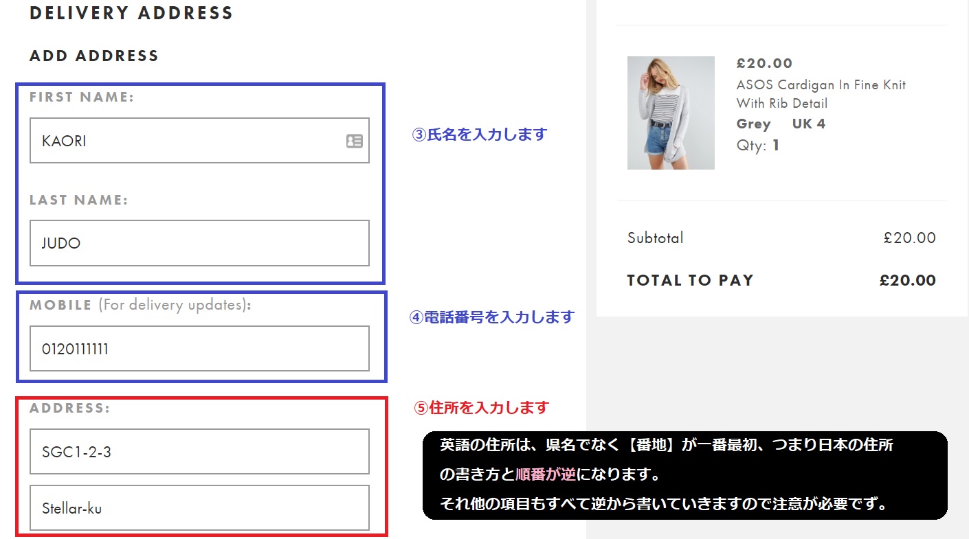 ・DELIVERY ADDRESS・・・「配送先住所」を入力します。海外のショップの場合は【番地】から記載しますので日本と逆と覚えておけばOKです!